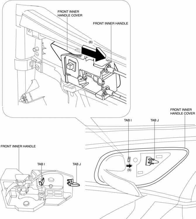 8. Remove the front inner handle in the direction of the arrow (6) shown in the figure while detaching the tab J.