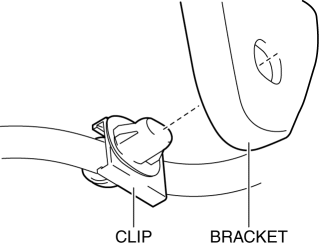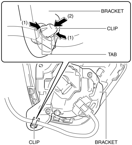 5. While pressing the clip tab in the direction of the arrow (1) shown in the figure, press the clip in the direction of the arrow (2) shown in the figure to detach the clip tab and bracket.