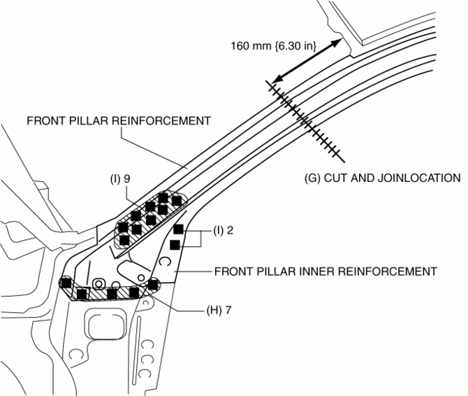 When installing the front pillar reinforcement and the front pillar inner reinforcement separately, plug weld the 11 locations indicated by (I) shown in the figure.