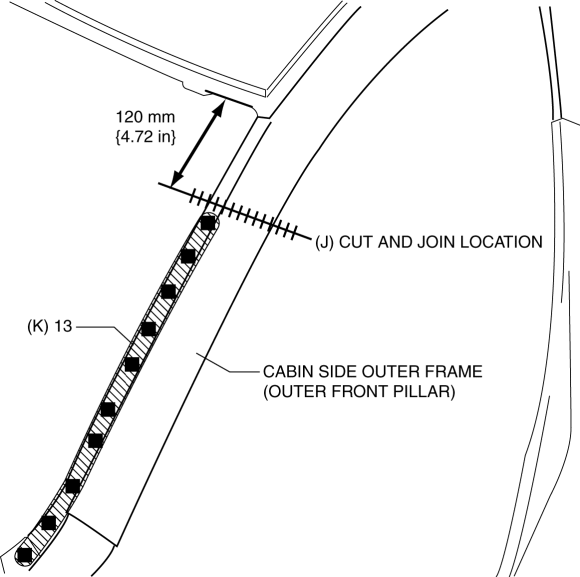 13. Plug weld the 86 locations indicated by (K) shown in the figure, then install the cabin side outer frame (outer front pillar outer).