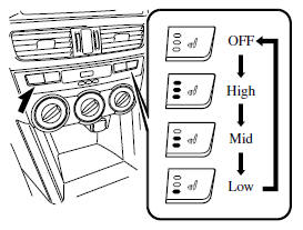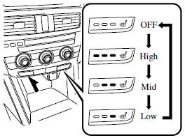 Press the seat warmer switch to illuminate the indicator light while the ignition is switched ON. The mode changes as follow each time the seat warmer switch is pressed.
