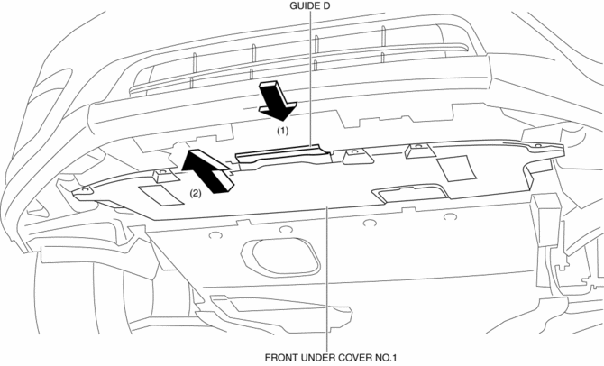 4. Remove the front under cover No.1 in the direction of the arrow in the order of (1), (2) shown in the figure while detaching the guide D.