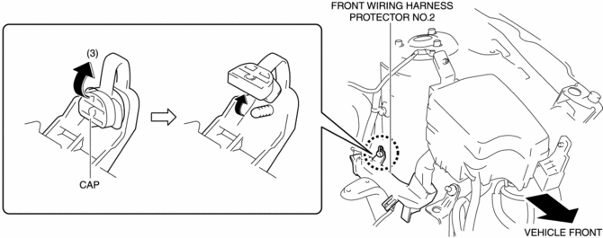 10. Detach all the tabs and front wiring harness protector No.2 and remove front wiring harness protector No.2.