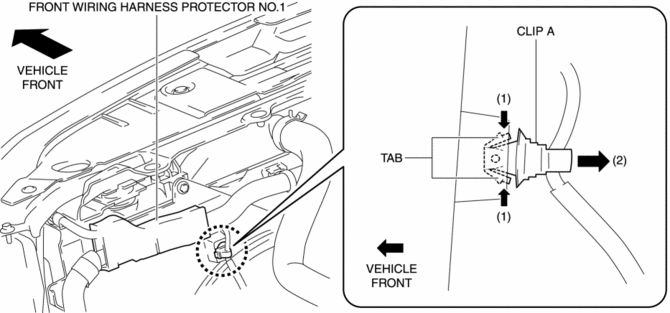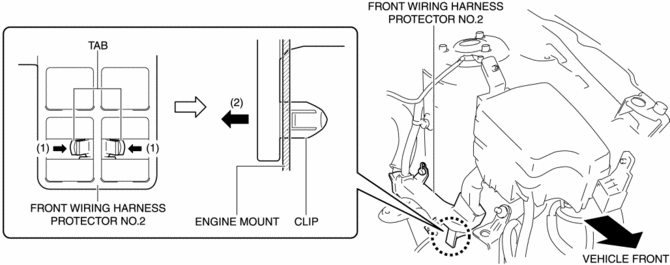 2. While pressing the clip tabs in the direction of arrows (1) shown in the figure, pull the clip in the direction of arrow (2) to detach it from the engine mount.