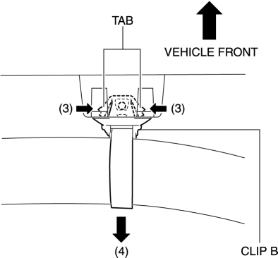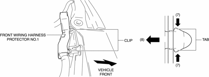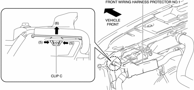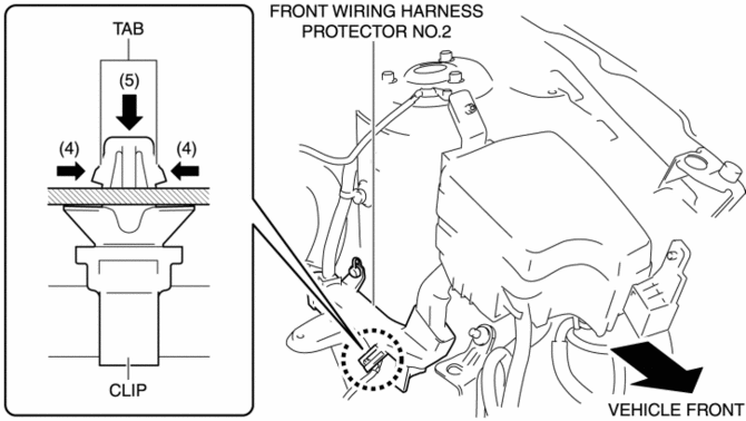 6. While pressing the clip tabs in the direction of the arrows (4) shown in the figure, push out the clip in the direction of the arrow (5) shown in the figure to detach the clip tabs from front wiring harness protector No.2.