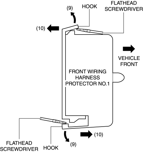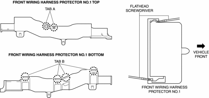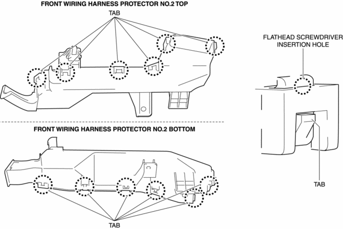 8. Insert a tape-wrapped flathead screwdriver into the gap between front wiring harness protector No.2 and the tabs shown in the figure.