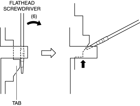 9. Move the flathead screwdriver in the direction of the arrow (6) shown in the figure, lift up the front wiring harness protector No.2 tab to detach the tab from front wiring harness protector No.2.