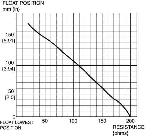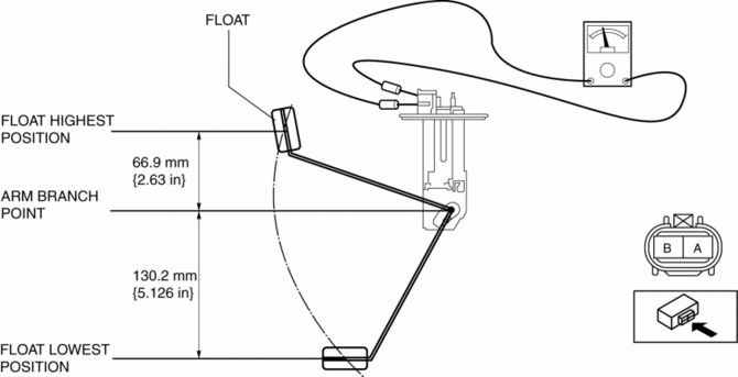 2. Verify that the resistance at fuel gauge sender unit (sub) terminals B and A is as indicated in the table according to the height of the float.