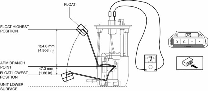 1. Verify that the resistance at fuel gauge sender unit (main) terminals D and C is as indicated in the table according to the height of the float.