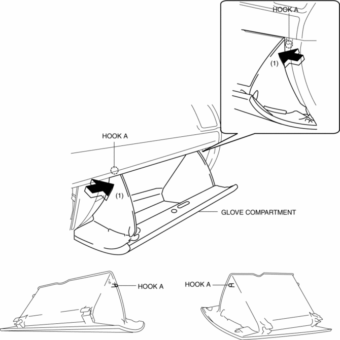 1. Push the glove compartment in the direction of the arrow (1) and remove hooks A.