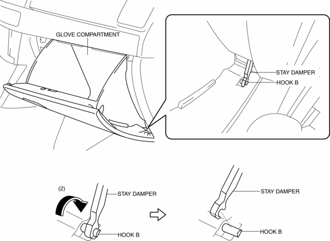 If the glove compartment is closed without being joined to the stay damper, the stay damper may be damaged. Verify that the stay damper is joined to the glove compartment before closing the glove compartment.