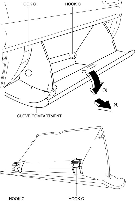 4. Pull the glove compartment in the direction of the arrow (4) and remove it while detaching hooks C.