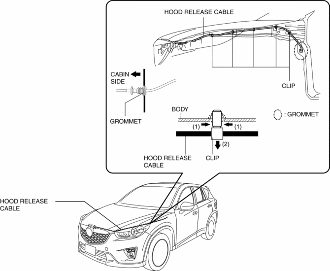 4. While pressing the tabs of the clip in the direction of arrow (1) shown in the figure, pull the clip in the direction of arrow (2) to detach it from the body.