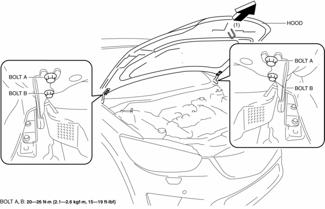 Removing the hood without supporting it could cause the hood to fall and cause serious injury. Always perform the procedure with at least another person to prevent the hood from falling.