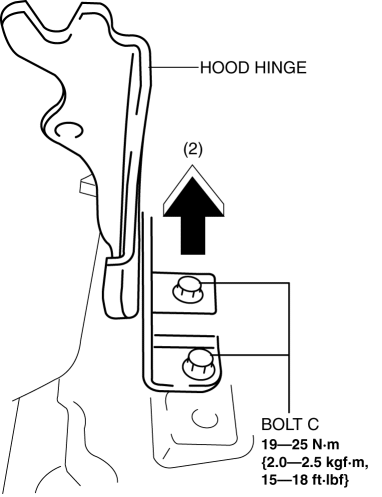 7. Remove the hood hinge in the direction of the arrow (2) shown in the figure.