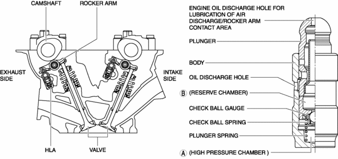 3. The oil in the reserve chamber (B chamber) which is decreased by supplying it to the high pressure chamber (A chamber), is supplied from the oil passage of the cylinder head.