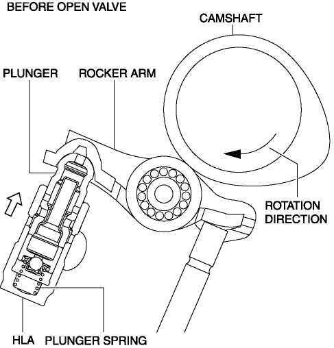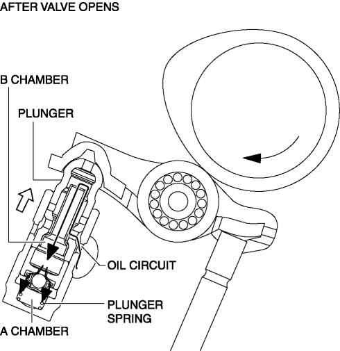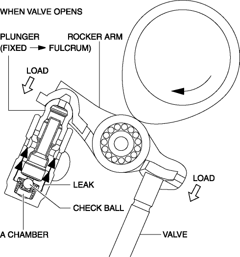 3. If the hydraulic passage is closed, the plunger is fixed becoming the rocker arm pivot point because the volume of the engine oil in the high pressure chamber is not changed.