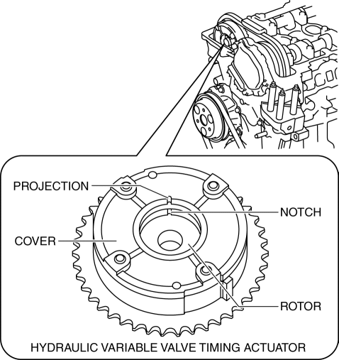 If the notch of the rotor and projection of the cover are still not aligned, replace the hydraulic variable valve timing actuator..
