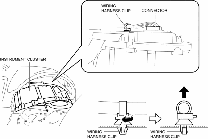 10. Rotate the wiring harness clip approx. 90 degrees, pull it in the direction shown by the arrow in the figure, and disengage the wiring harness clip tab from the instrument cluster.