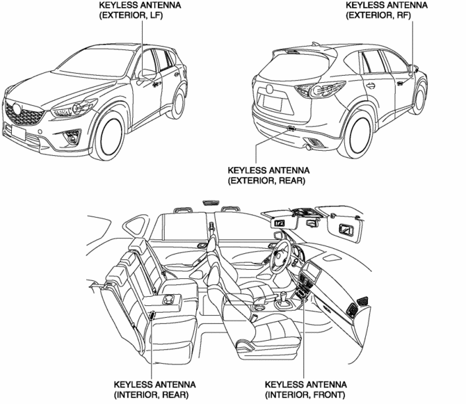 The keyless antennas for the vehicle exterior (driver-side, passenger-side, rear) form the request signal output area in the range of an approx. 80 cm {31 in}
