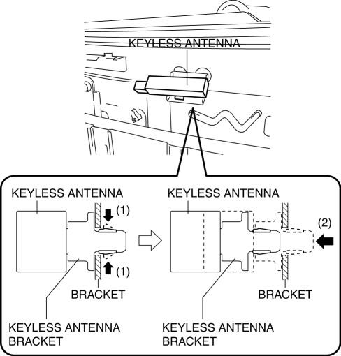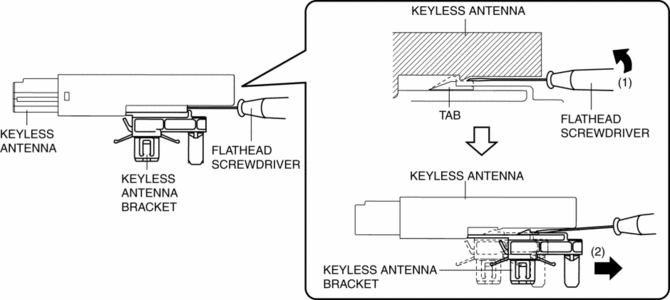 4. While pressing the keyless antenna bracket tab in the direction of arrow (1) shown in the figure, press it in the direction of arrow (2) to detach the keyless antenna bracket tab from the bracket.