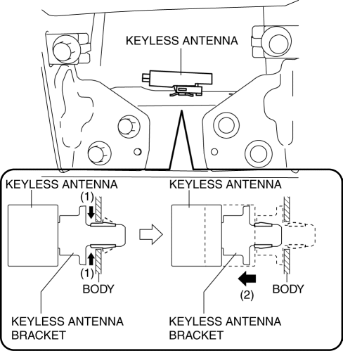 4. While pressing the keyless antenna bracket tab in the direction of arrow (1) shown in the figure, press it in the direction of arrow (2) to detach the keyless antenna bracket tab from the body.