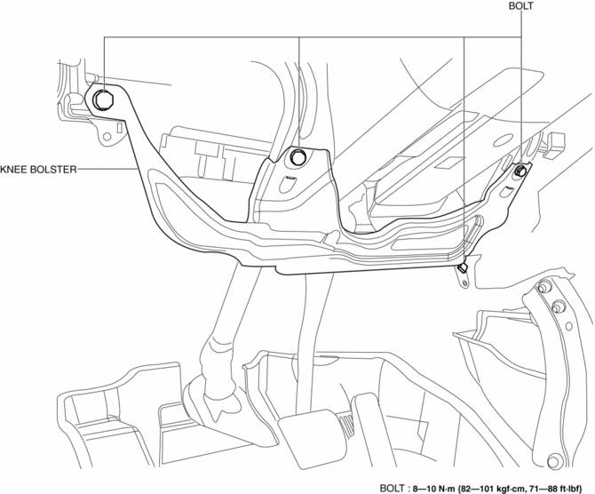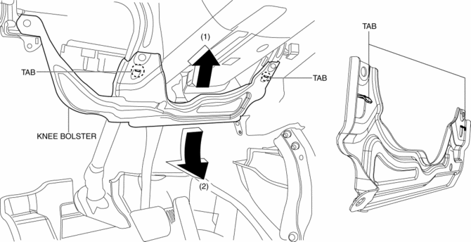 4. Pull the knee bolster in the direction of the arrow in the order of (1), (2) while detaching tabs.