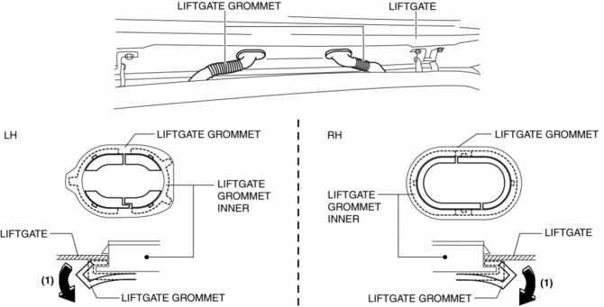 7. Partially peel the liftgate grommet in the direction of arrow (1) shown in the figure, and remove the liftgate grommet from the liftgate grommet inner.