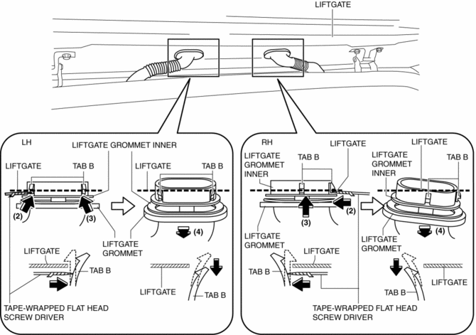 8. Using a tape-wrapped flathead screwdriver, press the liftgate grommet inner tabs B in the directions of arrows (2) and (3) shown in the figure and remove the liftgate grommet inner from the liftgate in the direction of arrow (4).