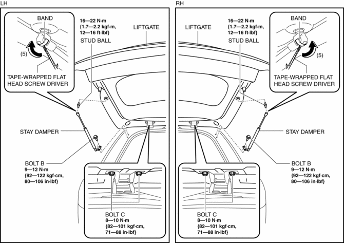 Removing the stay damper, liftgate hinge securing bolt, or liftgate without supporting the liftgate may cause the liftgate to fall off and injure you. When removing the stay damper, liftgate hinge, or liftgate, always use two persons to perform the work.