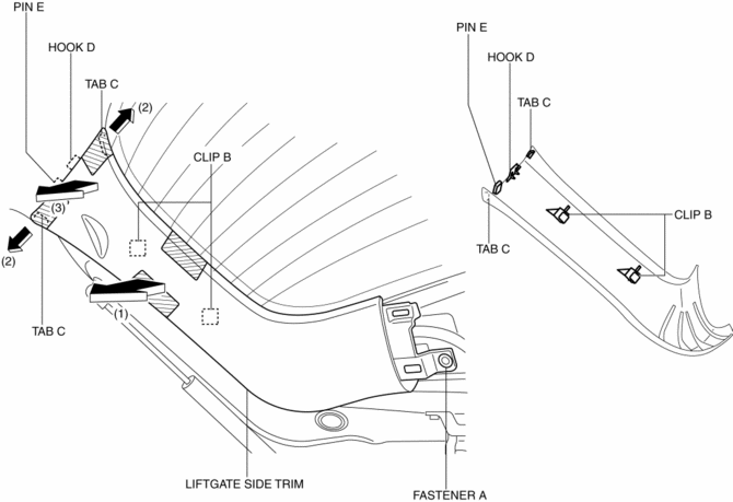 4. Take the shaded area shown in the figure, detach tabs C while pulling the liftgate side trim in the direction of the arrow (2) shown in the figure, then detach the hook D, pin E while pulling in the direction of the arrow (3).