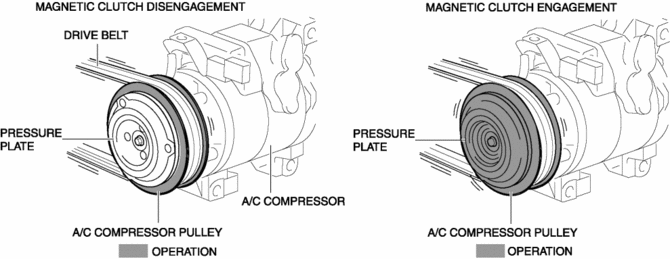 1. If there is energization in the magnetic clutch stator from the A/C relay, the magnetic clutch stator operates and the pressure plate is engaged with the A/C compressor pulley.