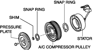 1. If there is no energization in the magnetic clutch stator from the A/C relay, the pressure plate cannot be engaged with the A/C compressor pulley because the magnetic clutch stator does not operate.
