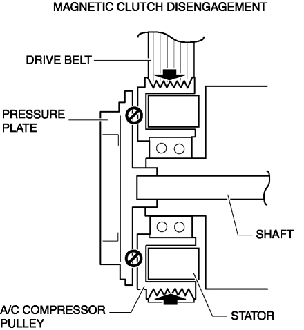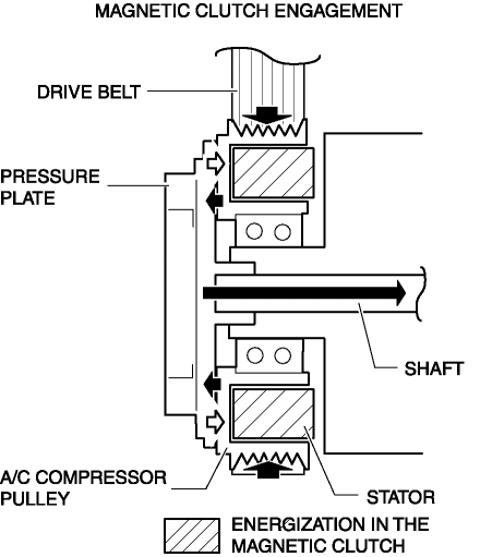 1. If there is no energization in the magnetic clutch stator from the A/C relay, the pressure plate cannot be engaged with the A/C compressor pulley because the magnetic clutch stator does not operate.