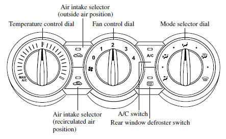 • When maximum cooling is desired, set the temperature control dial to the extreme cold position and set the air intake selector to the recirculated air mode, then set the fan control dial to position 4.