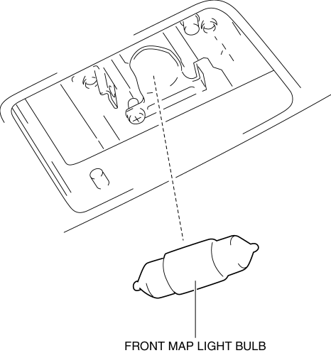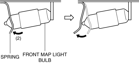 7. Press the front map light spring in the direction of the arrow (2) shown in the figure and detach the front map light spring and front map light bulb.