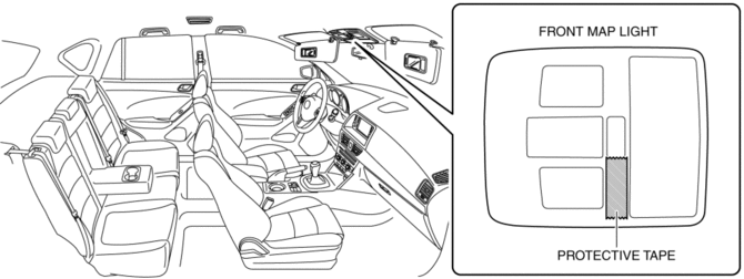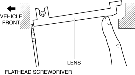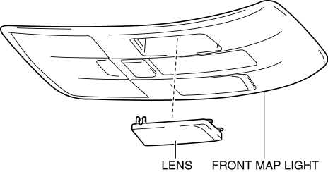 If a flathead screwdriver is inserted into the gap between the front map light and lens, the front map light could interfere with the flathead screwdriver resulting in damage to the front map light. When removing the lens from the front map light, perform the procedure after affixing protective tape to the front map light.