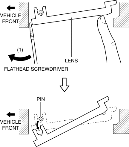 5. Move the flathead screwdriver in the direction of the arrow (1) shown in the figure, pull out the lens from the front map light, and detach the front map light pin and lens.