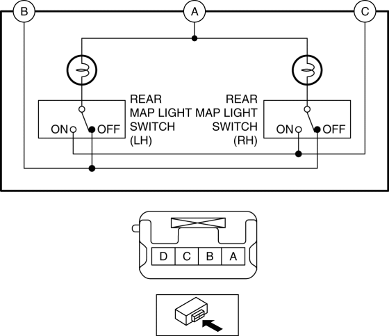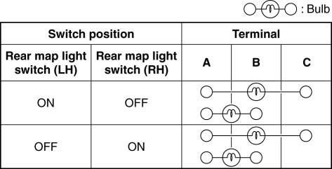 3. Verify that the continuity between the rear map light terminals is as indicated in the table.