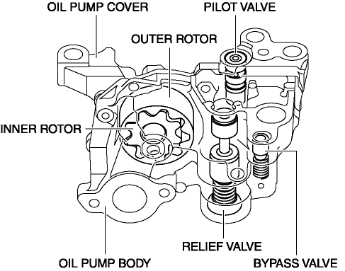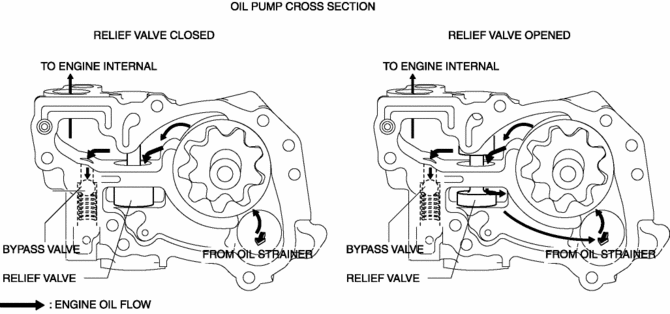 The relief valve and bypass valve is pushed and opened if oil pressure increases excessively when starting an extremely cold engine. As a result, the engine oil flows and excessive oil pressure increase is suppressed.