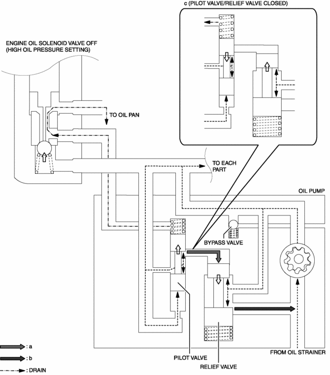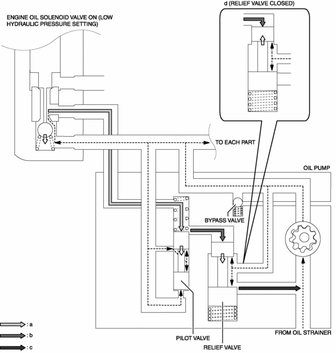 When oil pressure is less than the pilot valve opening pressure, the pilot valve closes. As a result, the relief valve closes and engine oil flow stops (oil pressure increase).