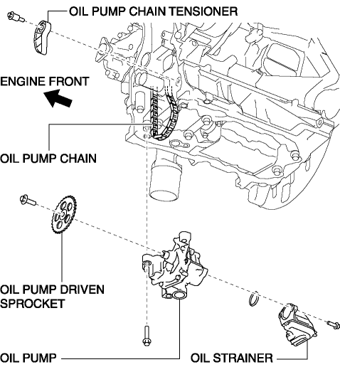 The oil pump suctions the engine oil in the oil pan through the oil strainer and pumps engine oil into the engine.
