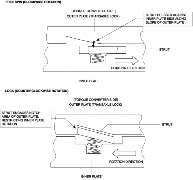 The inner plate for the one-way clutch is connected to the front internal gear and the outer plate is connected to the transaxle.
