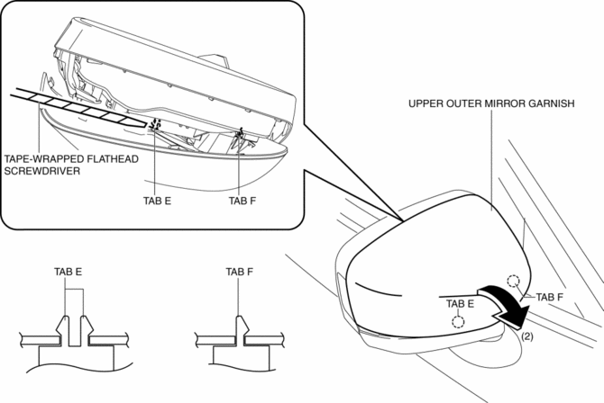 4. Insert a tape-wrapped flathead screwdriver into the upper outer mirror garnish and remove tab F, G in the direction of arrow (2).