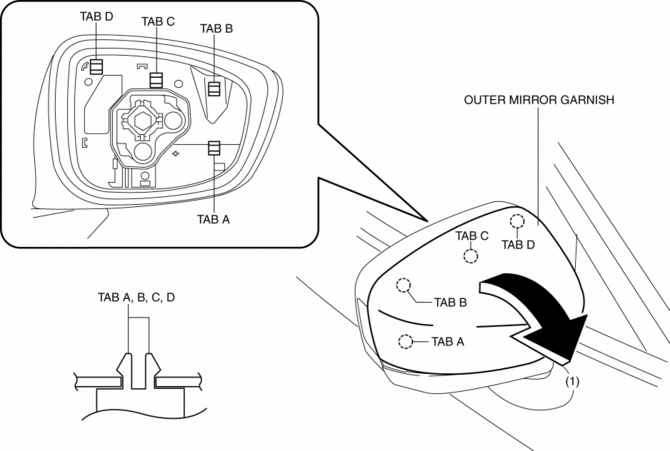 3. Insert a tape-wrapped flathead screwdriver into the upper outer mirror garnish and remove tab A, B, C, D in the direction of arrow (1).