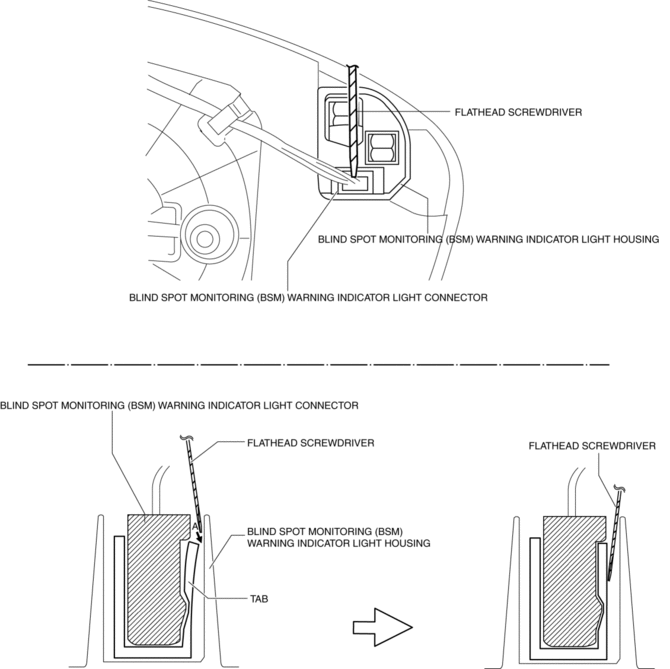 Lightly pull the blind spot monitoring (BSM) warning indicator light connector and verify that the blind spot monitoring (BSM) warning indicator light housing cannot be pulled off. If the connection is poor, insert a tape-wrapped flathead screwdriver into position A shown in the figure and engage the connector.