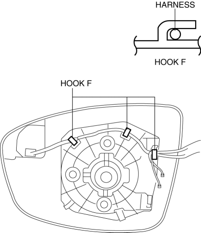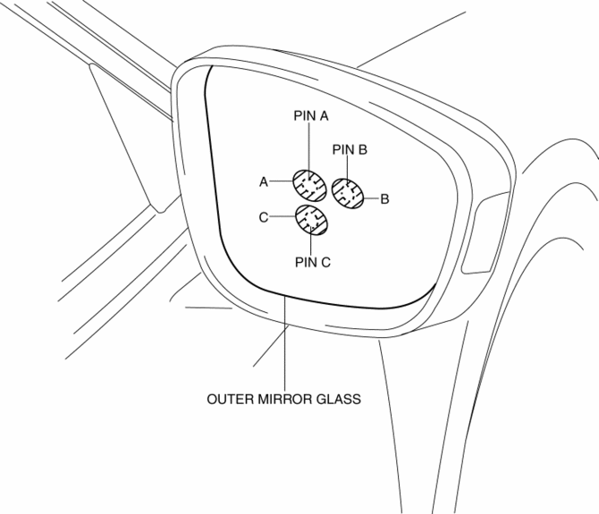 When installing the outer mirror glass, if excessive force is applied to the area other than cross-hatched area, the outer mirror glass could be damaged.