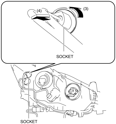 8. Rotate the socket in the direction of the arrow (3) shown in the figure and remove it from the front combination light in the direction of the arrow (4) shown in the figure.