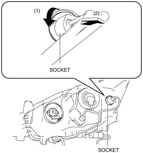 3. Rotate the socket in the direction of the arrow (1) shown in the figure and remove it from the front combination light in the direction of the arrow (2) shown in the figure.