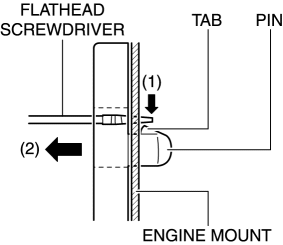6. While pressing the pin tab in the direction of the arrow (1) shown in the figure using a flathead screwdriver, pull the pin in the direction of the arrow (2) shown in the figure to detach the pin tab and engine mount.